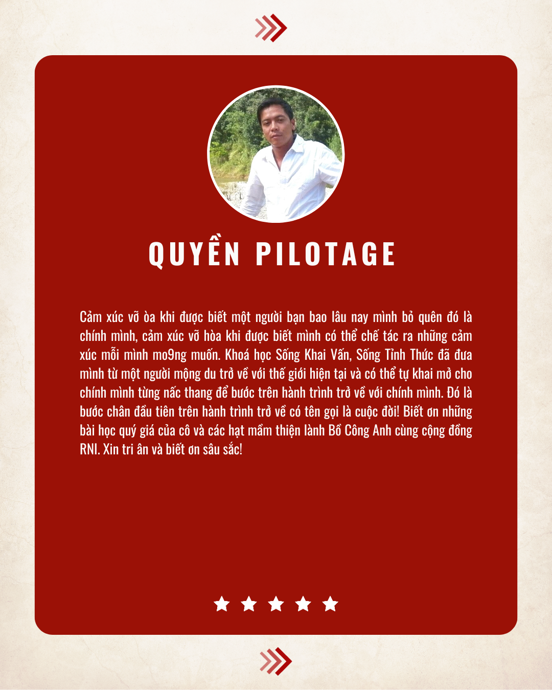 "Nhận bằng 'Nhà Khai Vấn Tỉnh Thức', tôi xúc động sâu sắc. Khóa học giúp tôi khám phá sức mạnh nội tâm – nhẹ nhàng như bồ công anh, nhưng kiên cường và lan tỏa giá trị thiện lành. Biết ơn RNI và những người đã đồng hành cùng tôi."
