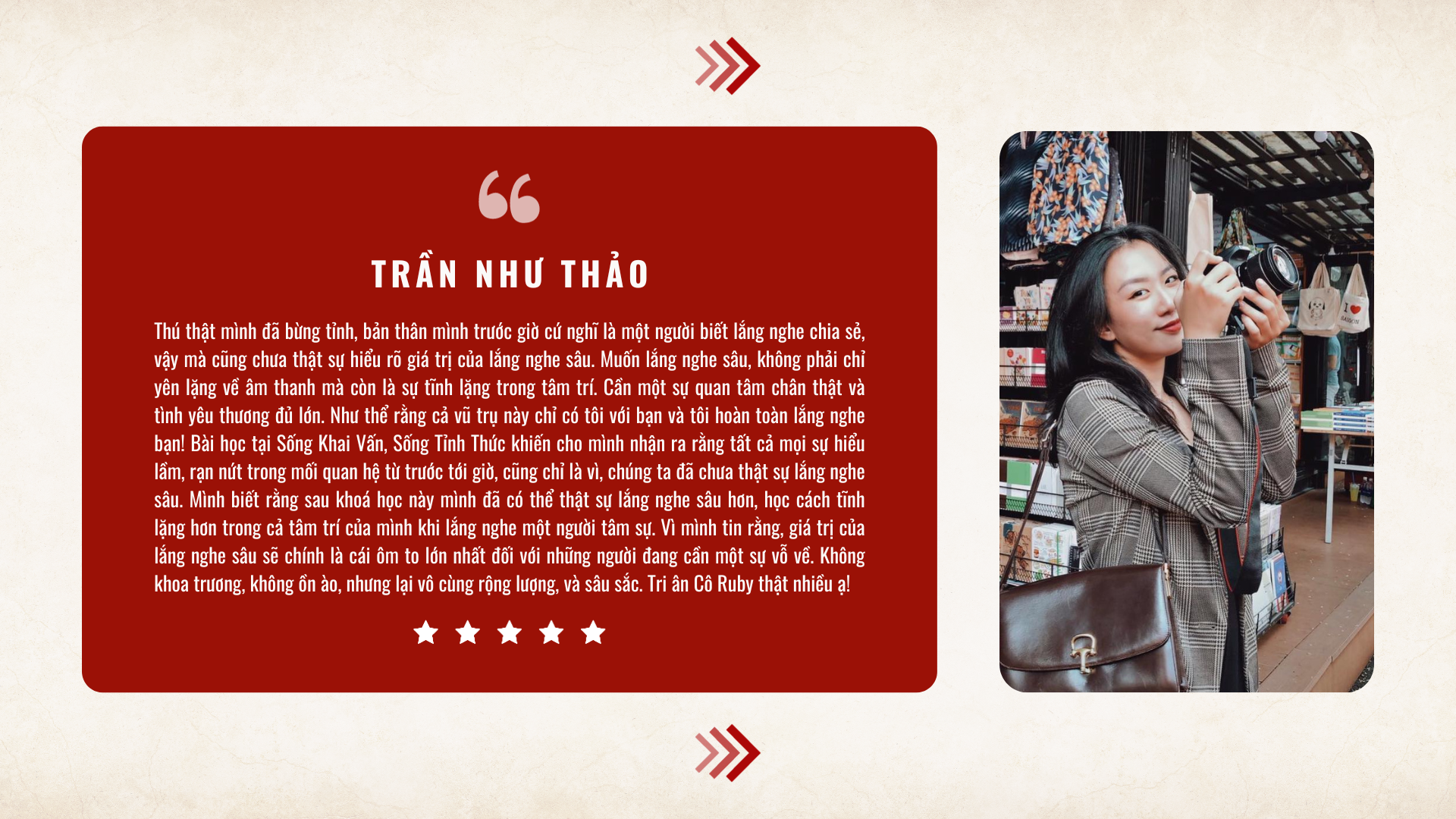 "Nghĩ về hành trình khai vấn, tôi luôn thấy biết ơn. Tôi học cách vững vàng khám phá bản thân và lắng nghe bằng trái tim rộng mở. Nhờ đó, các mối quan hệ trở nên sâu sắc hơn. Tôi trân trọng mọi cơ hội được học hỏi và trưởng thành cùng Thầy và bạn đồng hành."