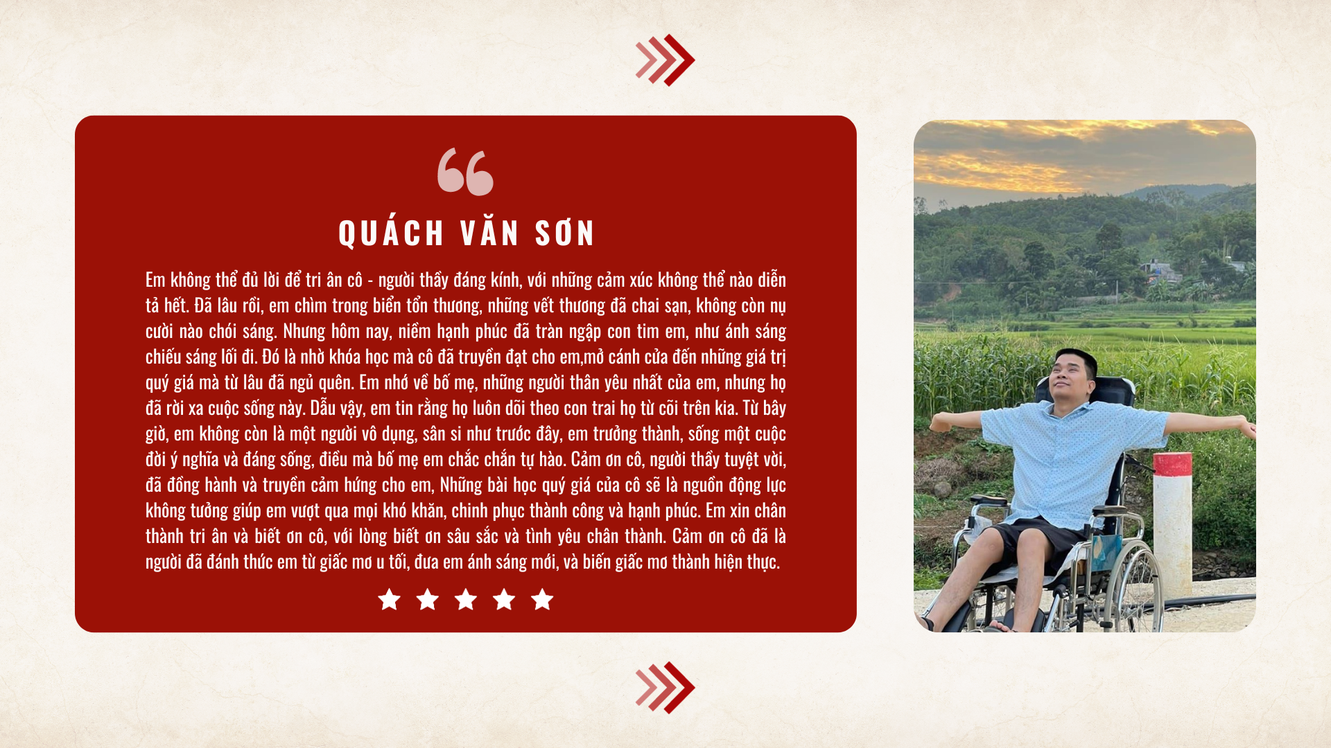 - Nhà giáo dục tâm huyết với phương châm “Giáo dục chậm - Chuyển biến sâu - Phát triển bền vững” đã biến những kiến thức phát triển bản thân trừu tượng thành những điều giản đơn, dễ áp dụng, giúp học viên tận hưởng hành trình phát triển một cách tự nhiên như hơi thở.